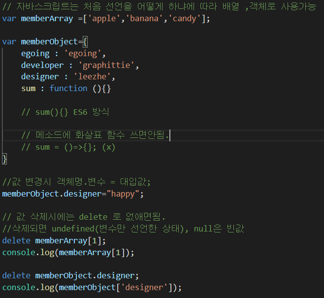 값 삭제시에는 delete를 쓰는데 변수만 선언하고 값이 없는 상태로 undefined가 된다.