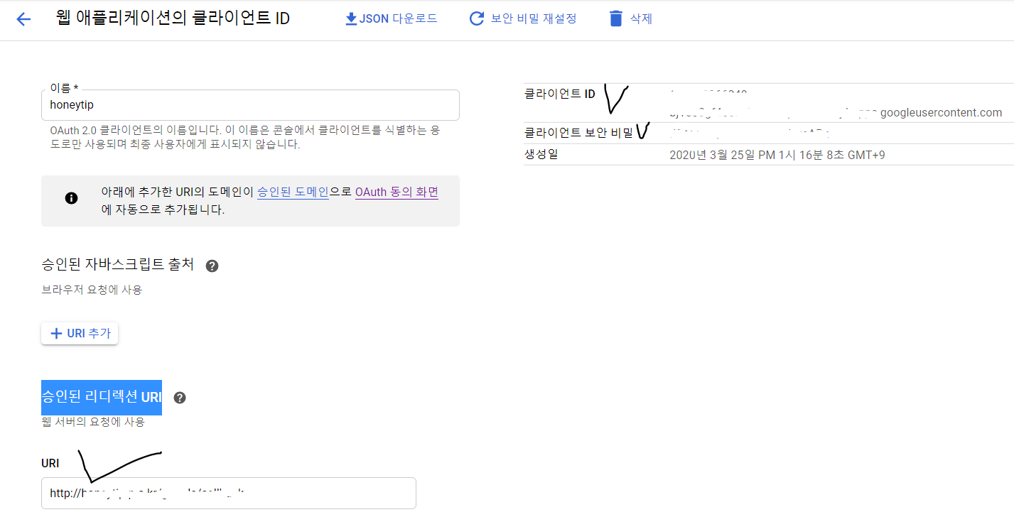 리다이렉트 url은 연습용으로 http도 괜찮지만 보안을 위해서 https 등록해주세요.