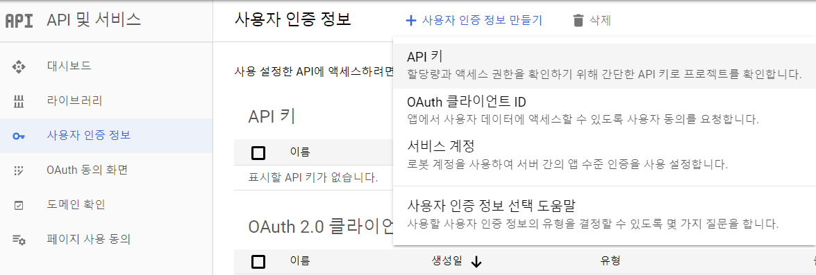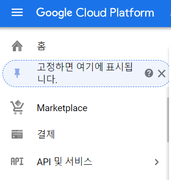 햄버거 메뉴를 누르면 API 및 서비스가 보입니다. 클릭해서 들어가 주세요