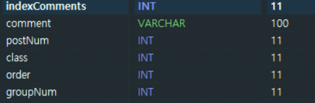 댓글 인덱스(indexComments)는 게시글 번호와 상관없이 댓글 혹은 대댓글이 작성되면 auto Increment로 1씩 증가되어 저장됩니다.